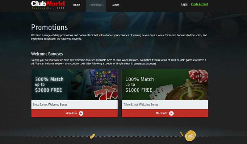 Club World Casinos - $3,000 Welcome bonus + $75 free chip when using crypto